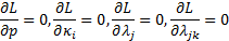 (b)   Applying analytical weighted Monte Carlo (using relative entropy) to the sort of calibration problem referred to above will therefore return (unless the calibration problem is ill-posed) a calibrated probability distribution which also has multivariate normal form. This is because the problem can be restated using Lagrange multipliers to one that involves minimising  defined as follows, where the  refer to whatever calibrations there are on the means and  to those on covariance terms (in general there will be fewer than  of the ):