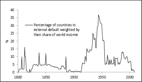 countries in external default weighted by share of world income